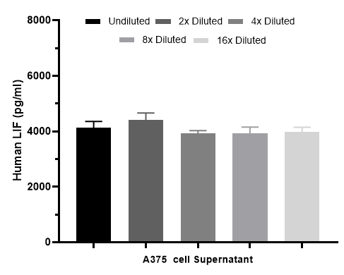 Interpolated concentrations of native LIF in human A375 cell culture supernatant samples. Interpolated concentration of native LIF was measured in duplicate at different sample concentrations. Undiluted samples were 12.5% cell supernatant. The interpolated dilution factor corrected values were plotted (mean +/- SD, n=2). |