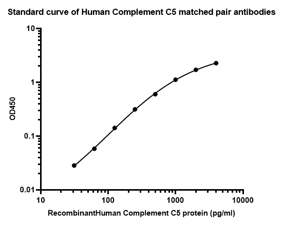 Sandwich ELISA analysis of human Complement C5 matched pair antibodies Elisa assay was performed by coating wells of a 96-well plate with 100 µl per well of capture antibody (HA722682) diluted in carbonate/bicarbonate buffer, at a concentration of 5 µg/ml overnight at 4℃. Wells of the plate were washed, blocked with 150 µl 0.05% tween-20 1%BSA blocking buffer, and incubated with serial diluted human Complement C5 protein starting from 4000 pg/ml to 0 pg/ml and detect antibody (HA722683, Biotin, 0.2 µg/ml) for 1 hour at 30℃ with shaking. Then the plate was washed and incubated with 100 µl per well of SA-HRP for 0.5 hour at 30℃ with shaking. Detection was performed using an Ultra TMB Substrate for 10 minutes at room temperature in the dark. The reaction was stopped with sulfuric acid and absorbances were read on a spectrophotometer at 450 nm. |