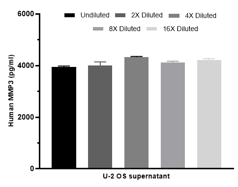 Interpolated concentrations of native MMP3 in U-2 OS cell culture supernatant. The concentrations of MMP3 were interpolated from the MMP3 standard curves and corrected for sample dilution. Undiluted samples are U-2 OS cell culture supernatant 100%. The interpolated dilution factor corrected values are plotted (mean +/- SD, n=2). The mean MMP3 concentration was determined to be 4,120 pg/ml in U-2 OS cell culture supernatant. |